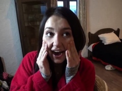 Small tit brunette amateur tugs on a big willie